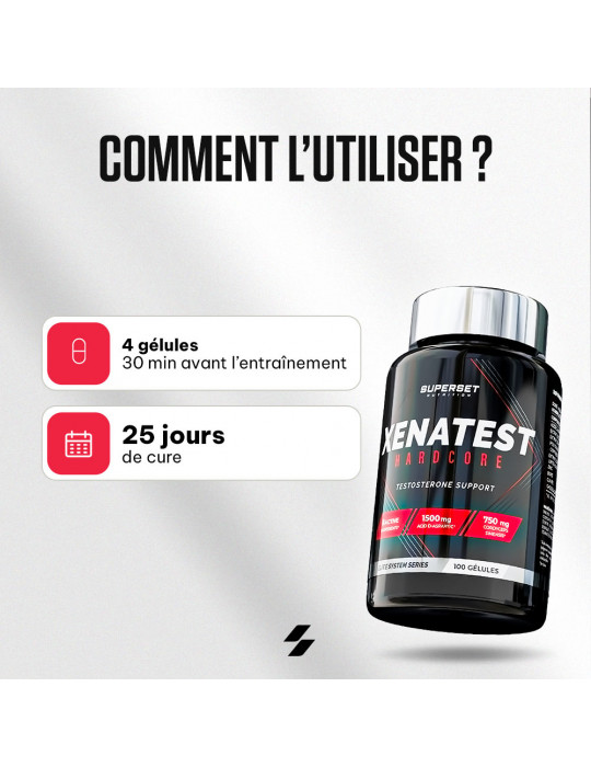 Le XENATEST HARDCORE (100 CAPS) est un complément alimentaire sans hormones aux propriétés anabolisantes naturelles mis au point par les nutritionnistes, préparateurs physiques et coachs de la marque française Superset Nutrition. Cette formule a été conçue pour soutenir la production de testostérone dans des limites physiologiques normales et contribuer au maintien de la masse musculaire.