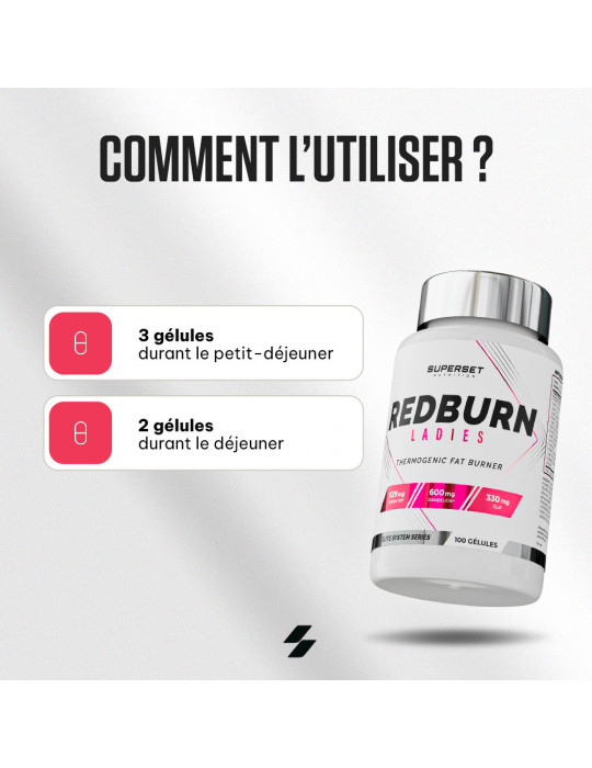 Développé spécifiquement pour répondre aux besoins des femmes, REDBURN LADIES (100 CAPS) est formulé par les experts en nutrition et coachs sportifs de Superset Nutrition. Ce brûleur de graisses thermogénique t’accompagne dans ta quête de minceur avec 9 ingrédients actifs soigneusement sélectionnés.