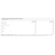 Ingrédients - saveur white chocolate : eau, lait écrémé, mélange de protéines (caséinate de calcium (lait), concentré de protéines de lactosérum (lait)), crème (lait), maltodextrine, stabilisants : gomme gellane, carraghénine ; Édulcorants : Acésulfame K, Sucralose ; Amidon Modifié, Arômes, Sel, enzyme: Lactase.