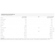 Ingrédients : 43% maltodextrine, eau, 21% fructose, sels de magnésium de l'acide citrique, 1,4% taurine, chlorure de sodium, chlorure de potassium, 0,28% extrait de graines de guarana (Paullinia cupana Kunth.), régulateur d'acidité - acide citrique ; arômes, conservateur - acide sorbique ; chlorhydrate de thiamine - vit. B1.