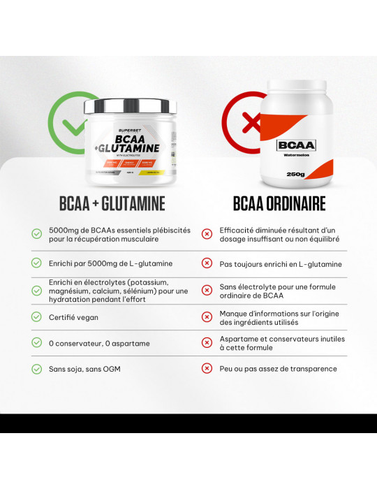 Le BCAA + GLUTAMINE (420G) de la marque Superset Nutrition est un incontournable pour tous les athlètes, que tu sois triathlète, cycliste, marathonien ou amateur de musculation. Cette formule hautement dosée en ingrédients actifs soutient ton endurance mais pas que !
